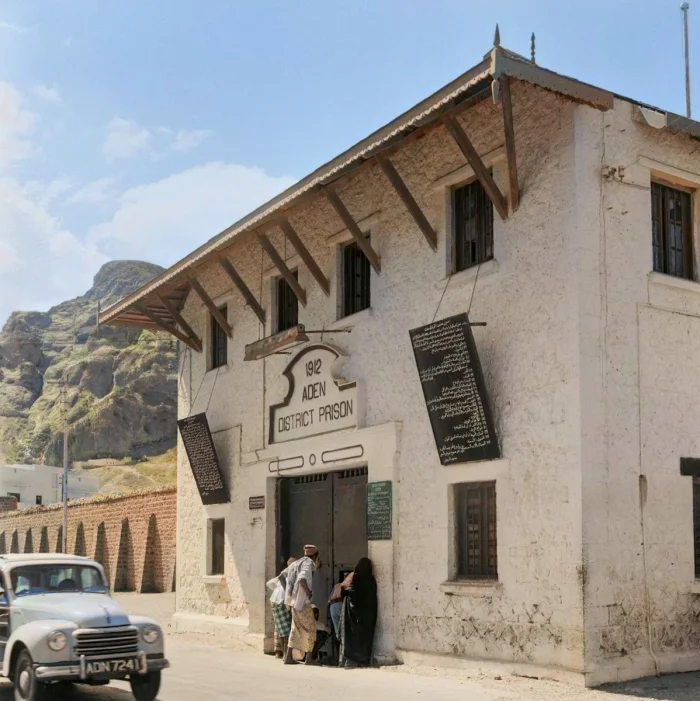 Группа людей у входа в тюрьму округа Аден в портовом городе Аден, Йемен, 1959 год.