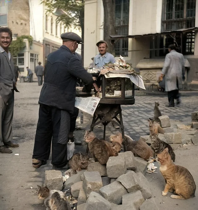 Продавец кебабов (жареного мяса) среди кошек. Стамбул, 1952 год.