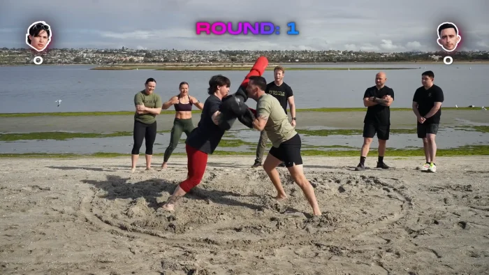 Первое соревнование заключалось в том, чтобы перетащить мешок весом 45.3 кг (100 фунтов) по песчаной поверхности. Мужчины уверенно одержали победу, что вызвало шок у женщин.
