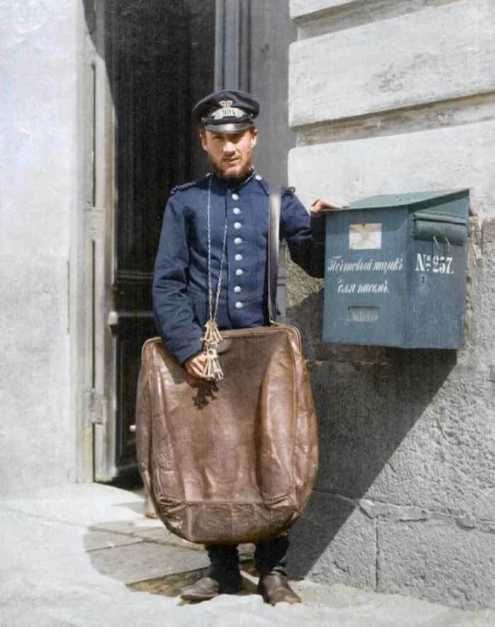 Очистка почтового ящика пешим почтальоном в Санкт-Петербурге, начало XX века.