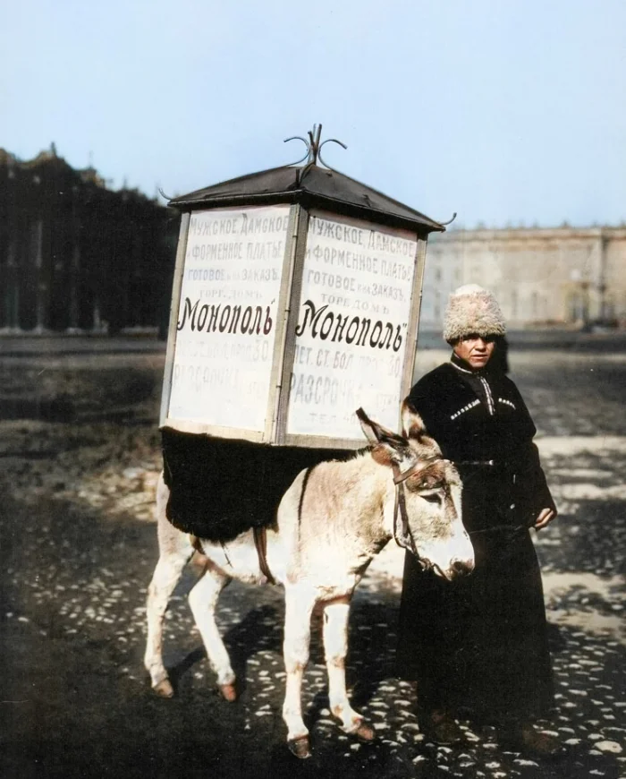 Живая реклама торгового дома мужской и женской одежды «Монополь» на Дворцовой площади. Санкт-Петербург, 1910 год.