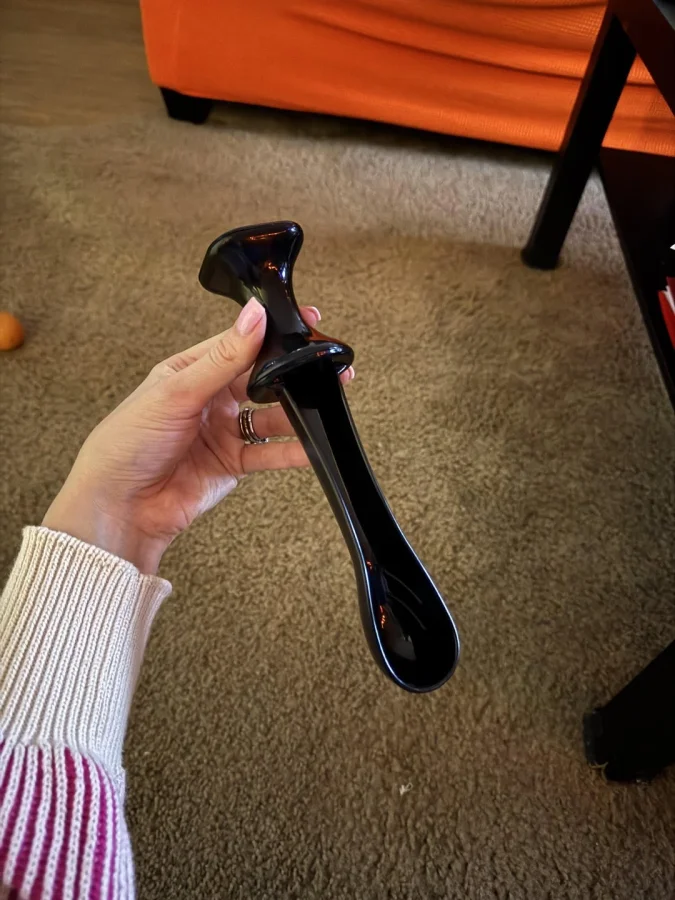 3. Странный предмет, выполненный из прозрачного кобальтово-синего пластика или акрила, обладающий волнистой формой и двумя плоскими сторонами. Он также имеет блестящую металлическую ручку