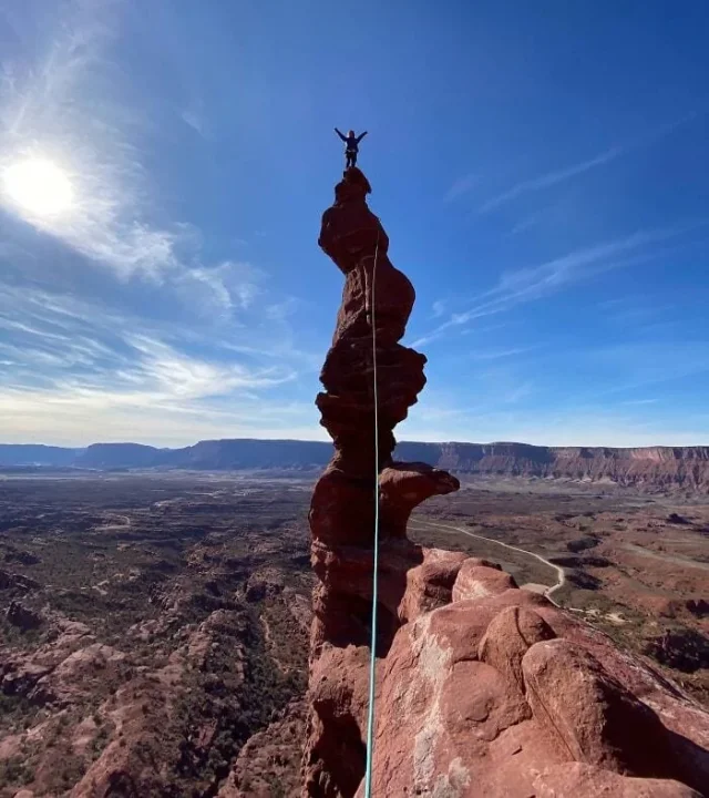 На фотографии — альпинистка Хейзел Финдли, которая висит на отвесной скале и ищет путь вверх, а не вниз. Её не держат канаты — она держит себя сама.