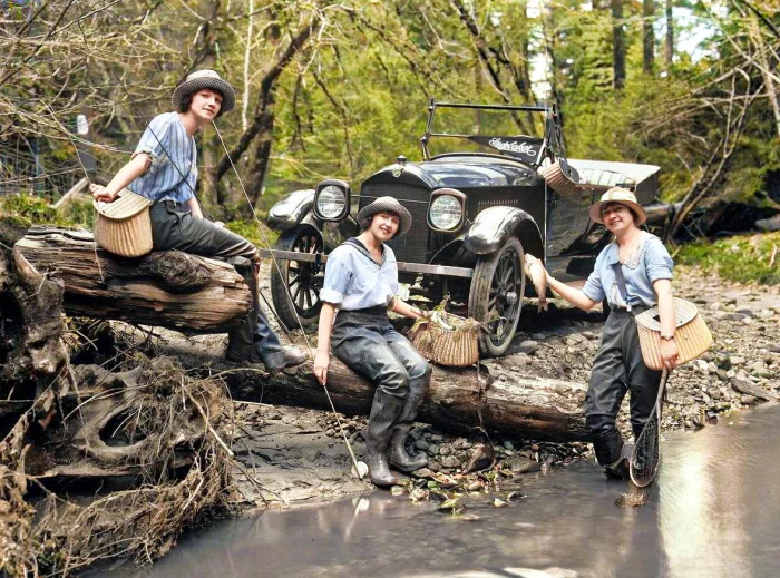 Девушки ловят рыбу рядом с автомобилем Studebaker Big Six, США, 1919 год.
