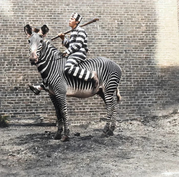 Комический преступник пытается сбежать из тюрьмы на спине восточноафриканской зебры, чучело которой было создано доктором Джеймсом Л. Кларком из Нью-Йорка для Университета Небраски.