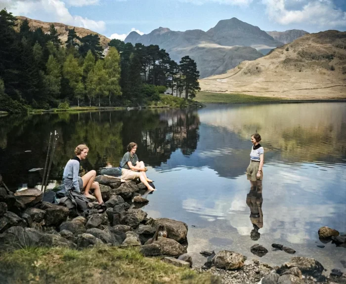 Три туристки отдыхают, окунув ноги в озеро Блеа Тарн. Великобритания, около 1940 года.