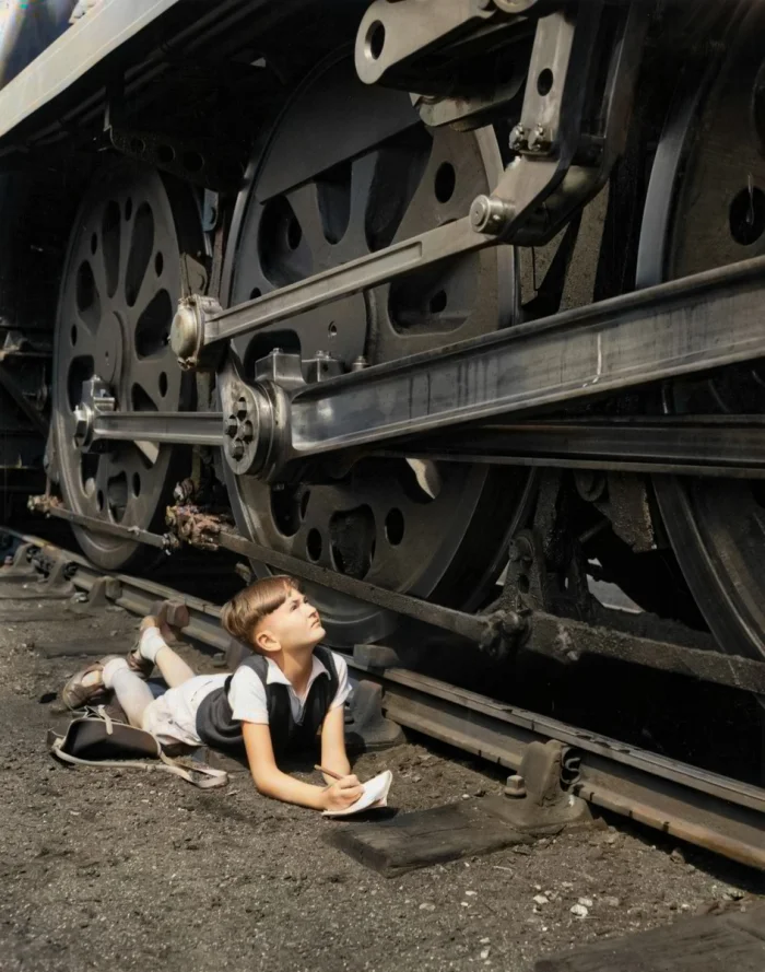 Десятилетний Джон Спид из Фархэма, графство Хэмпшир, осматривает паровоз на заводе Southern Region British Railways Works в Истли, 1960 год.