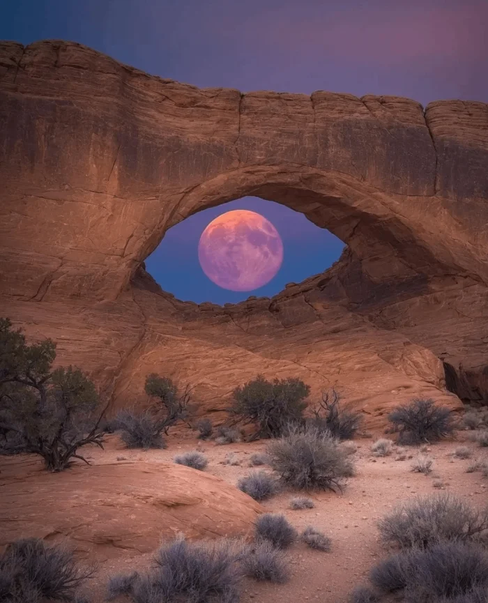 В парке Арки (Арчес), Юта, США, фотографу удалось запечатлеть невероятный момент: полная Луна встала точно в центре скальной арки, как гигантский зрачок в каменном глазу.