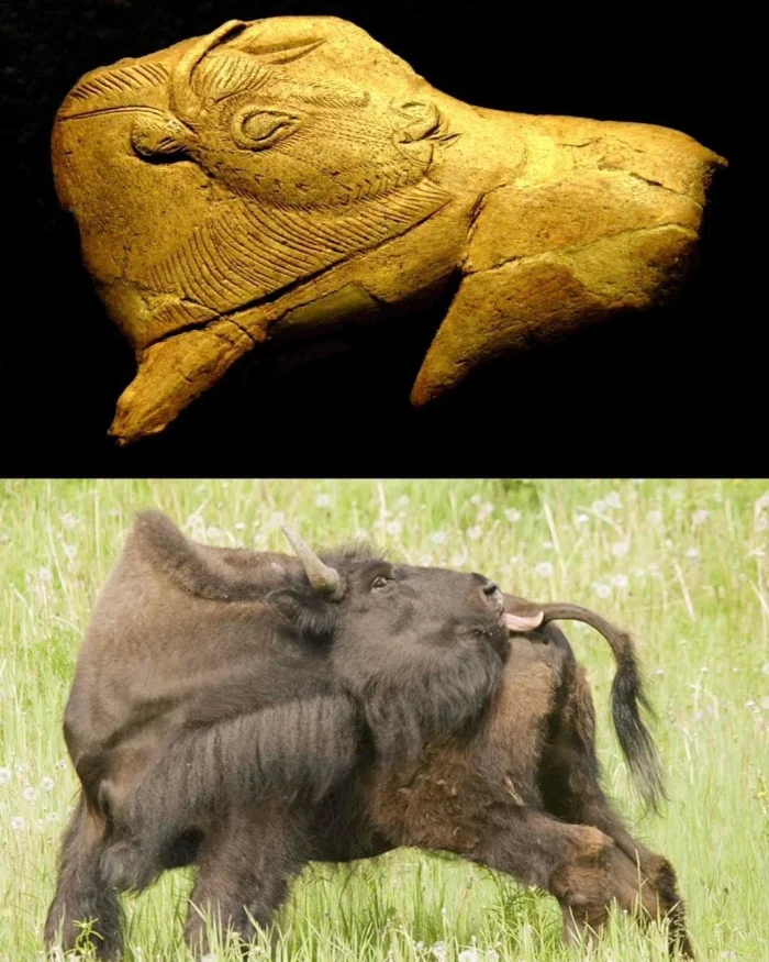3. «Бизон, вылизывающий укус насекомого». Этот артефакт из оленьего рога был найден во время раскопок во Франции и датируется 14 000 годами.