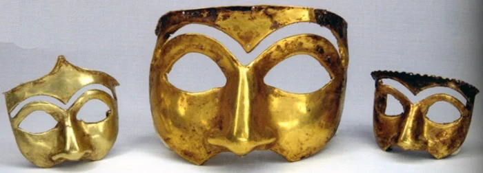 30. Золотые маски, найденные в пещере Калмакарех в Лорестане, Иран. Они датируются первой половиной первого тысячелетия до н.э. и хранятся в Национальном музее Ирана
