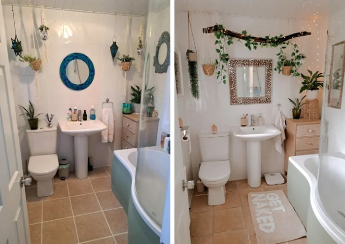 4. "Ванная комната теперь выглядит гораздо лучше! Приняла советы и добавила большее зеркало, передвинула ящики, повесила гирлянды"