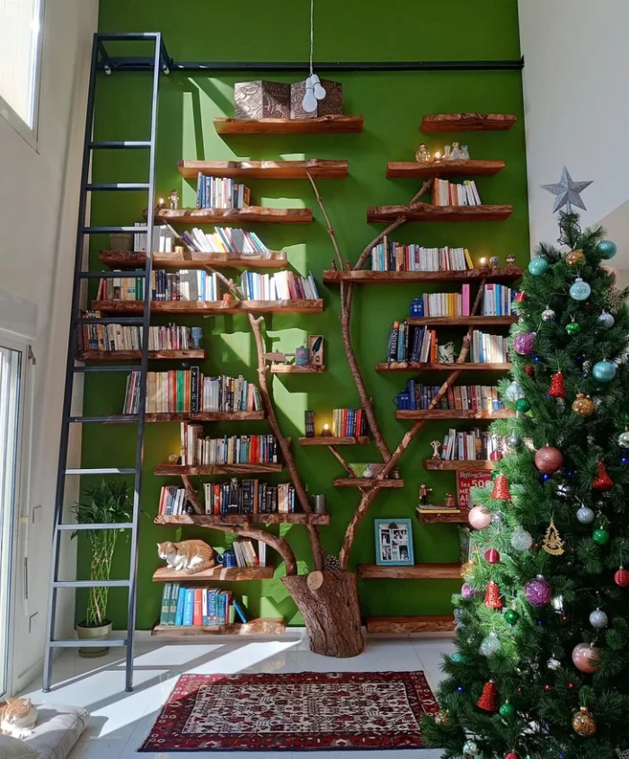 17. "Мы недавно приобрели квартиру в комплексе, окруженном сосновым лесом. Так захотелось перенести природу внутрь. Называем это библио-деревом"