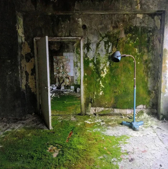 Это здание — бывшая больница, расположенная в Припяти. За десятилетия стены и пол покрылись трещинами и мхом, а старый светильник напоминает о присутствии человека в этом месте.