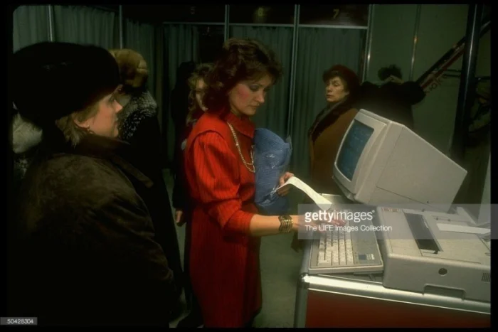 3. Продавщица магазина «Люкс» использует персональный компьютер для оформления покупки, 1989 год, Москва