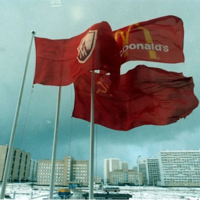 5. Капитализм в СССР: Флаги Москвы, СССР и McDonald’s на окраине города, 1989 год