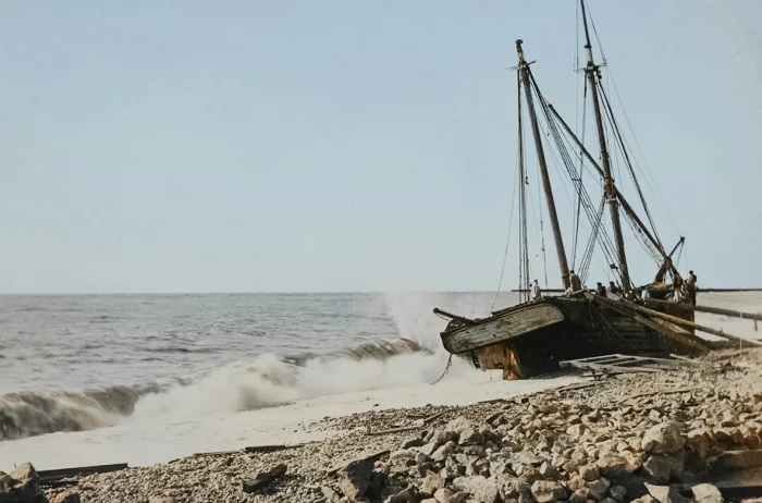 А это уже последствия урагана. После сильного шторма на берегу остался странный и печальный след борьбы человека с морем — выброшенное судно. Некогда гордый корабль, служивший людям, теперь беспомощно лежит на каменной гальке.