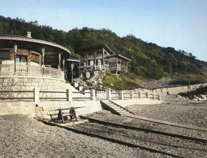 Справа — пляжный домик великих князей в «татарском» стиле. На переднем плане рельсы и лебедка для подъема ванны с морской водой. Архитектор И.Л. Монигетти.