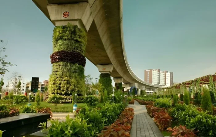 В этом месте ветка метро выходит на поверхность, Калькутта, Индия. А под ней парк, в котором гуляют люди