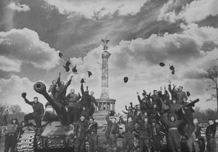 Советские танкисты у "Колонны Славы" в Берлине, 1945 год. Они долго шли к этой победе, и теперь пришло время отпраздновать её.