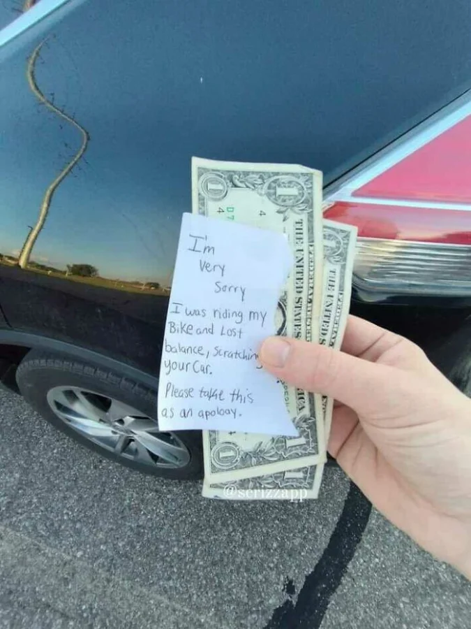 «Мне очень жаль. Я ехал на велосипеде и потерял баланс. Поцарапал вашу машину. Пожалуйста, возьмите это в качестве извинения».
