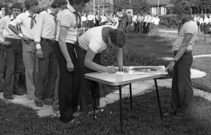 1-й отряд подписывает письмо протеста президенту США, фото Павла Сухарева, август 1976 года, Московская область, деревня Бутынь