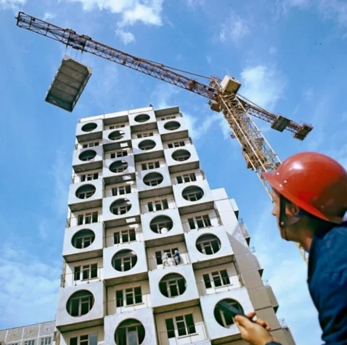 Рабочие монтируют звезду на шпиле, высотное здание на Котельнической набережной, Москва, 1951-й