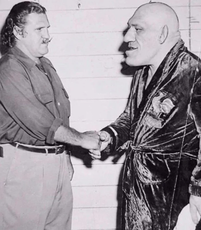 Уильям Стейг, создатель Шрека, с тем самым человеком, который стал прототипом зеленого героя мультфильмов: профессиональный рестлер Морис Тилль, 1940-е