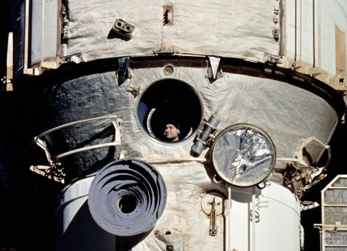 наблюдает в иллюминатор за приближением шаттла «Дискавери». 3 февраля 1995 года.