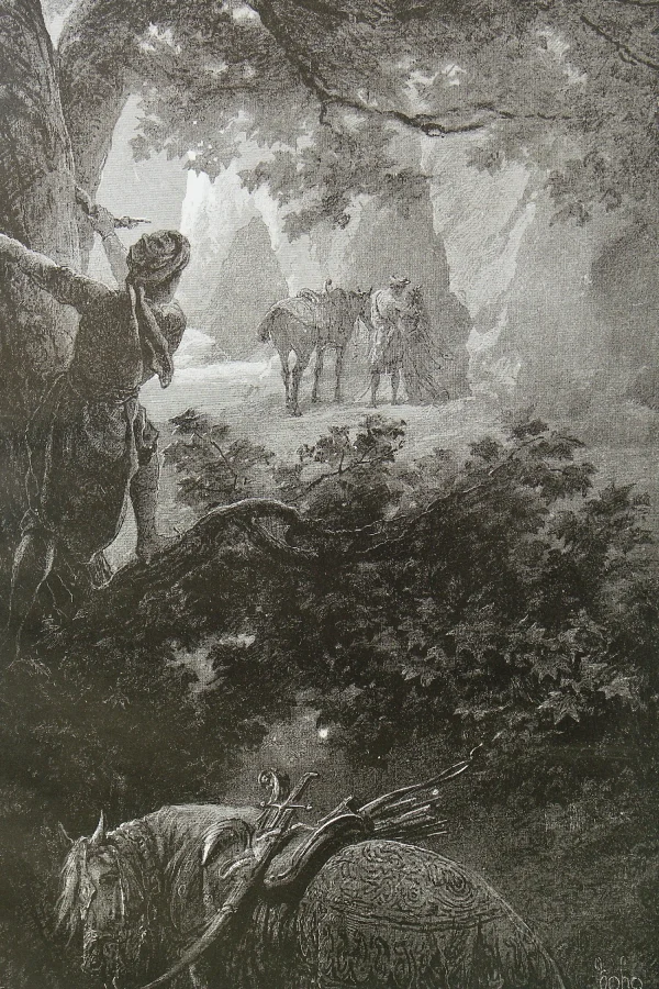 «Автандил с коня вниз прянул под деревьями в лесу, На одно из них взобрался, привязав коня внизу»