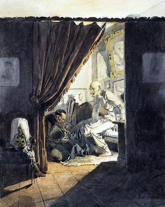 Третий рисунок совсем сбил меня с толку… То, что я теперь увидел перед собою, казалось мне одним из лучших, самых живых и остроумных рисунков сепией кисти Гаварни. Это был офицер, спаги или охотник в Африке в момент, когда, спеша за своими товарищами, он с самым воинственным хладнокровием выслушивал прощальные слова нежной красавицы, которая в трогательной позе плакала и всхлипывала на его плече…