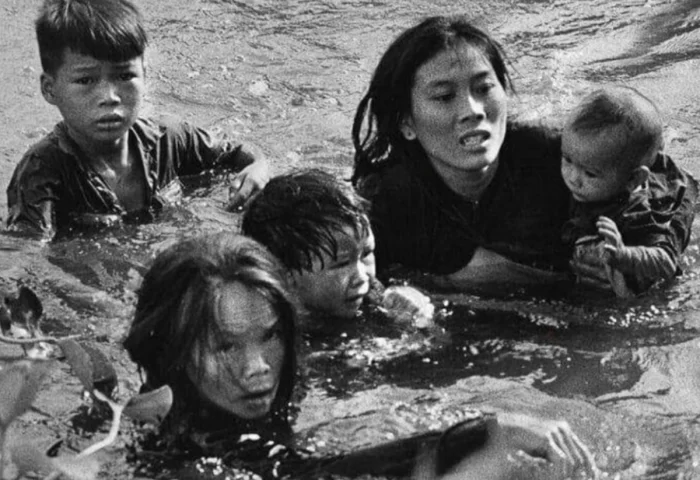 Мать спасает детей, переплывая реку, Южный Вьетнам, 1966 год