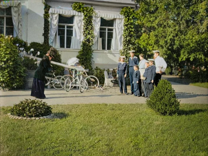 Императрица Мария Федоровна фотографирует своих семерых внуков. Санкт-Петербург, 1914 год.