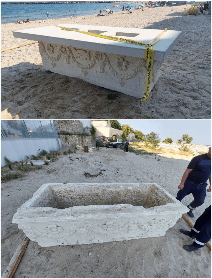 Турист заметил этот 1700-летний римский саркофаг, который использовался в качестве стола в пляжном баре в Варне, Болгария