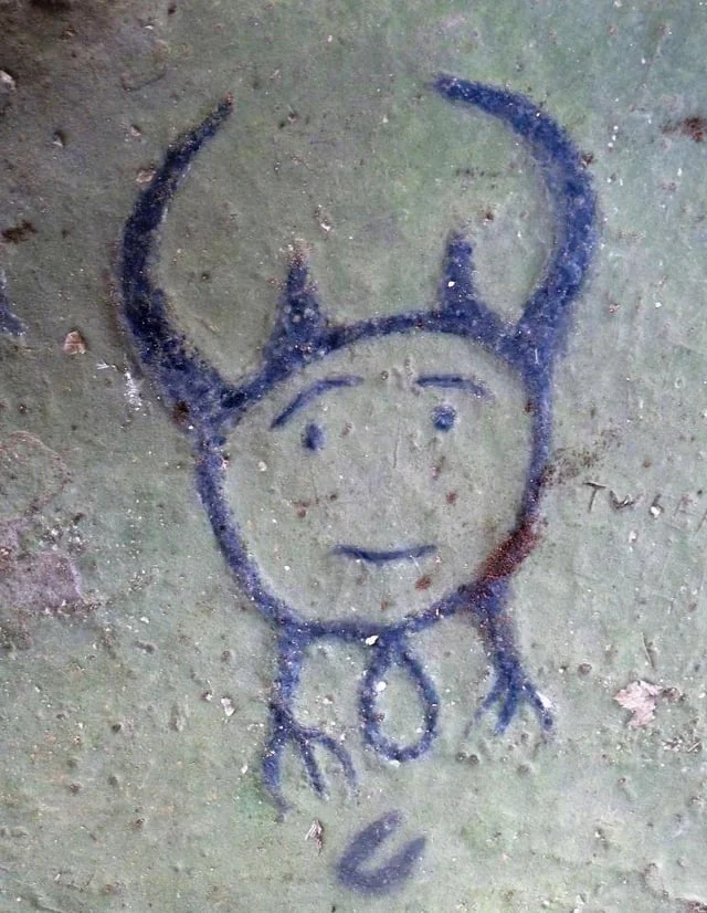 Это петроглиф, сделанный американскими индейцами в 1000-1650 гг. Петроглиф — древнее изображение, высеченное или выгравированное на камне. Данный петроглиф лица с головным убором является частью петроглифа Льва, который содержит 37 изображений людей и других животных, а также отпечатки ног каждого из них.