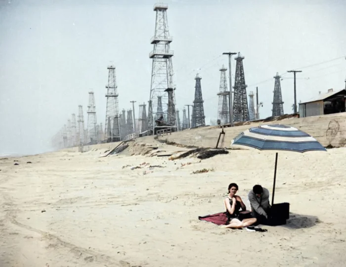 Нефтяные вышки на пляже в Калифорнии, 1920-е годы.