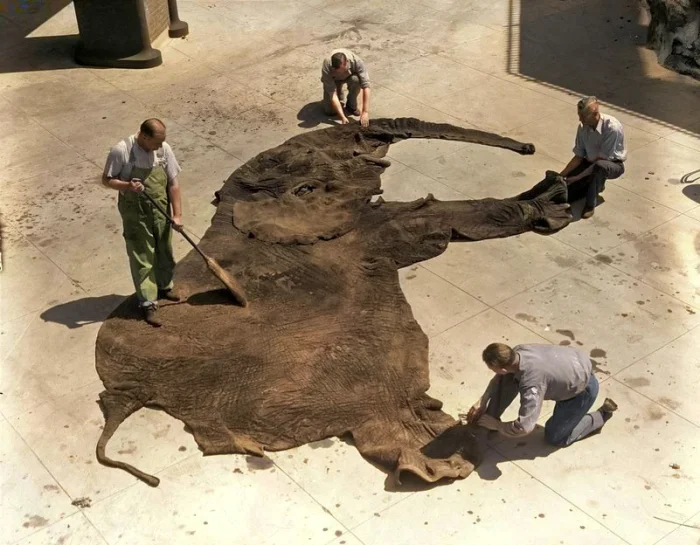 Сотрудники музея очищают кожу слона для выставки в Американском музее естественной истории в Нью-Йорке, июнь 1933 года.