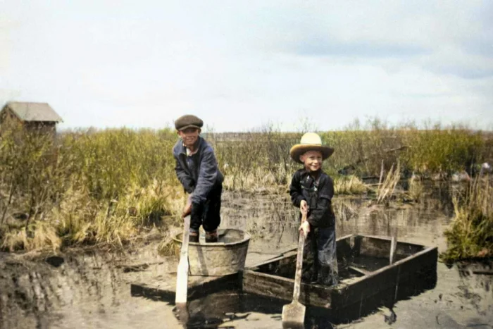 Сплав по болоту, Альберта, Канада, 1938 год.