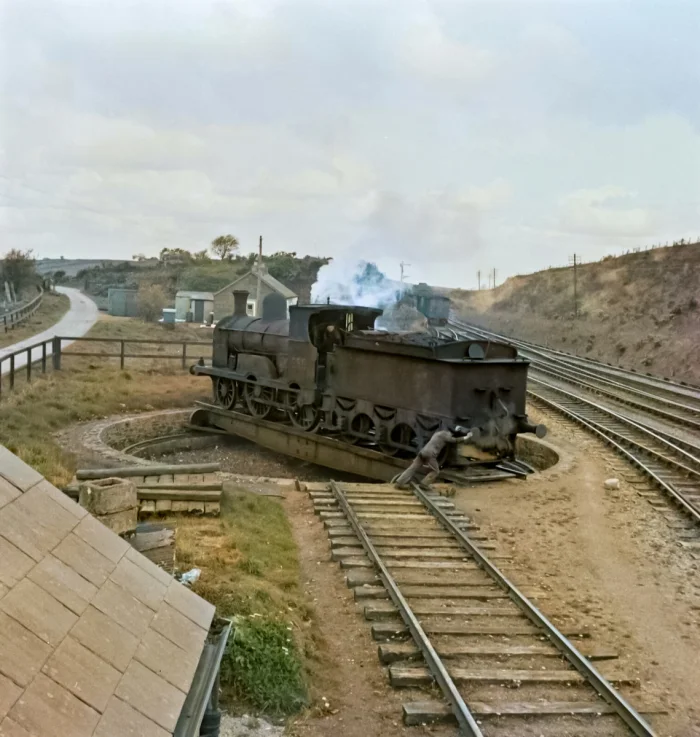 Поворотный круг требует усилий как минимум двух человек, но второго не видно из-за паровоза.