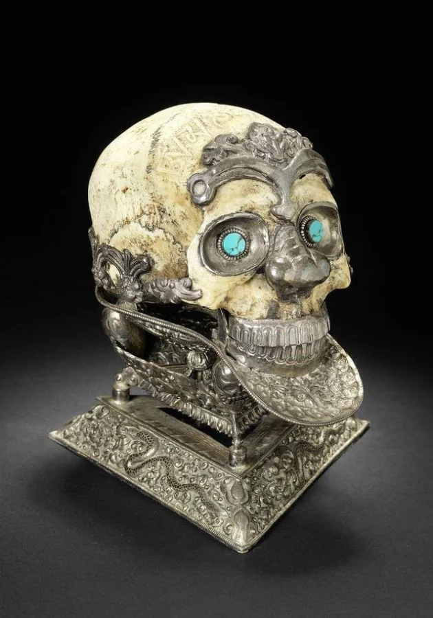 Капала - церемониальная чаша из черепа в серебряной оправе из Тибета или Непала. Серебряные глаза украшены бирюзой. 19 век.