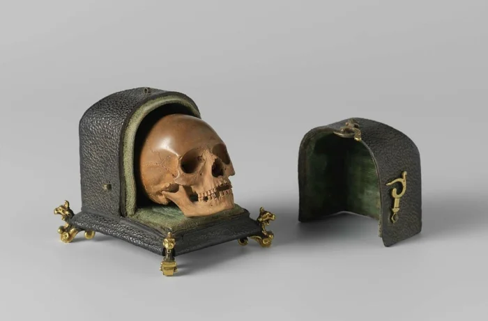 Миниатюрная вещица диаметром 4 сантиметра, череп вырезан из самшита Альбертом Янцем Винкенбринком. Помещён в шкатулку из железа и меди и обшит настоящей шагренью, 1650 г.