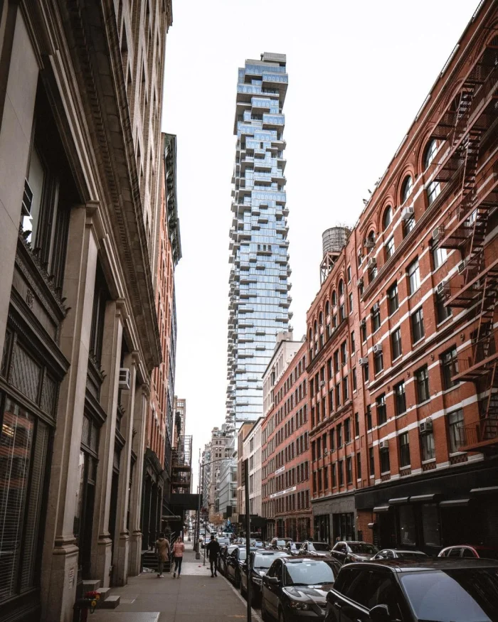 В самом сердце Манхэттена, на 56 Леонард-Стрит, среди классических небоскрёбов, возвышается 57-этажный небоскрёб высотой 250 метров, который выглядит так, будто его собрали из гигантских блоков игры "Дженга".