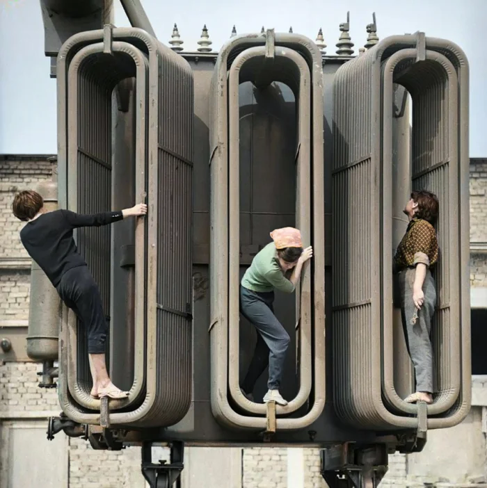 Молодые рабочие монтируют трансформатор. СССР, 1967 год.