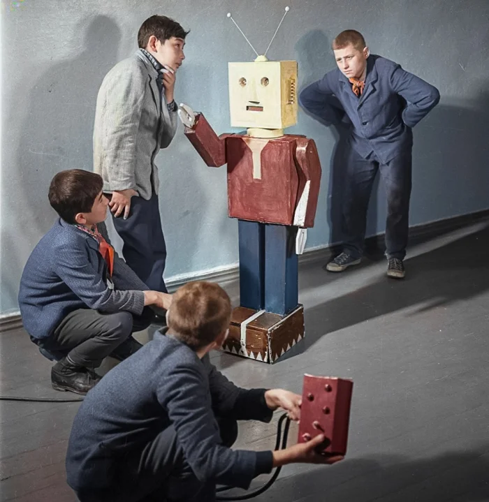 Школьники из Фрунзенского дворца пионеров, занимающиеся в кружке технического творчества, со своим роботом. Киргизская ССР, 1965 год.