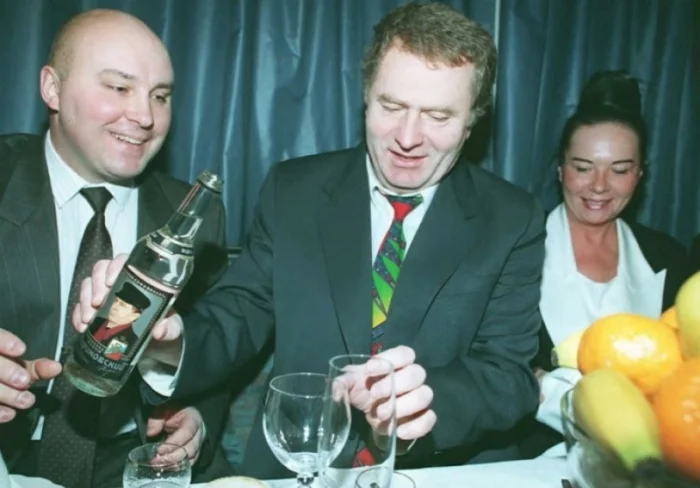 5. Владимир Жириновский выпивает рюмку «Водки Жириновского», отмечая годовщину победы своей партии на последних парламентских выборах, 1994 год.