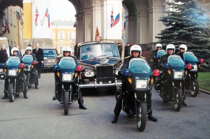 8. Мотоциклетный эскорт королевы Великобритании Елизаветы II во время визита в Москву, 1994 год.