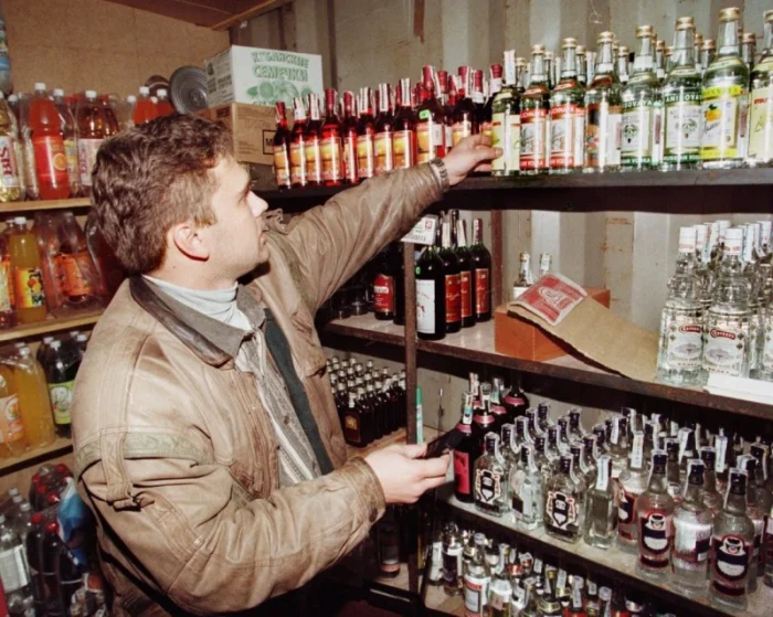 9. Налоговый инспектор проверяет акцизные марки на водке, 1998 год.