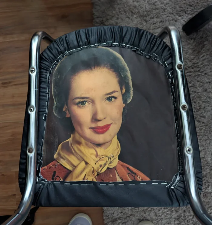 А это когда-то был барный стул, и лица знаменитостей пришиты специально - чтобы понять, какой из стульев отсутствует в конце дня, когда их переворачивают и ставят на стойку. Ну и симпатично выглядит, если даже стул на столе стоит. Логика примерно такая - если просохачен один стул, то легче отследить стул с лицом, который известно за каким столиком стоял, чем идентичный стул, один из многих.