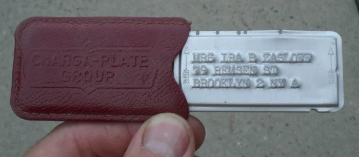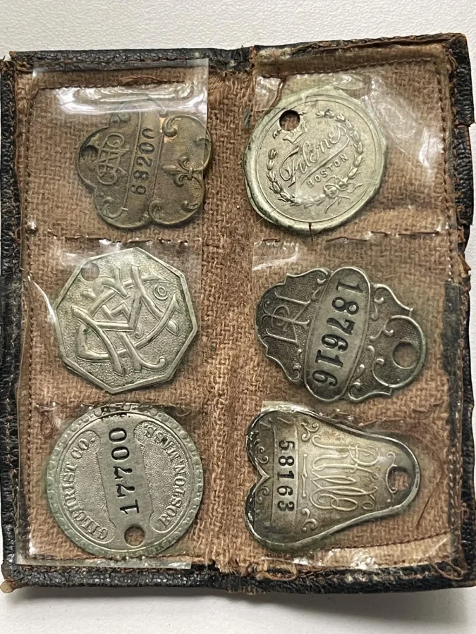 Так это же "кредитные монеты\жетоны". Это предшественники кредитных кард. Применялись как раз в Бостоне. Покупатель показывал свой жетон, брал товар, на его счет (номер жетона) записывалась покупка. В конце месяца покупатель все оплачивал. Ну как в деревне в сельпо в тетрадку, только там по имени, а жетоны безымянные. Поэтому их очень быстро пошли воровать и обманом забирать товар из магазинов, поэтому после 1930 их вытеснили "именные кредитные пластинки", на них имя было. А вот и именная -