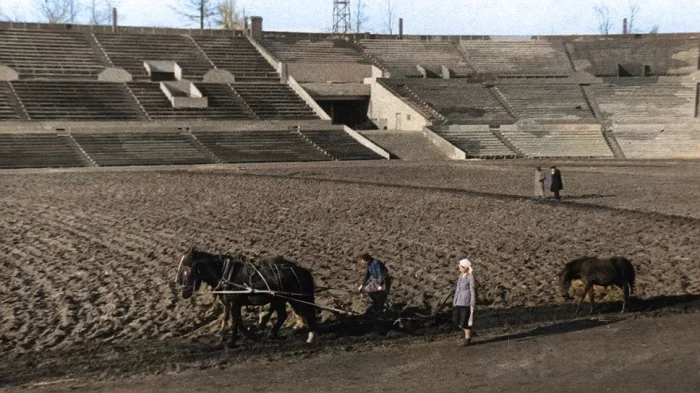 Работники стадиона «Динамо» сеют газон. Москва, 1931 год.