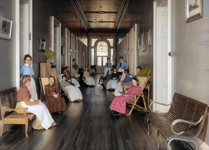 Пациенты и персонал женского отделения городской психиатрической больницы Сент-Луиса сидят на стульях или стоят в дверях вдоль чистого и аккуратного коридора, позируя перед камерой. Фотография сделана 28 марта 1904 года сотрудником городского водоканала.